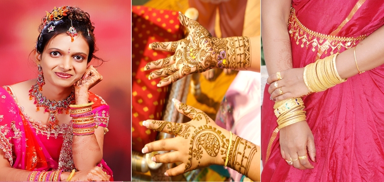 - Bangles – The bride wears bangles or bracelets made of gold, glass or other metals depending upon the custom. Both gold and glass are part of an essential attire in most parts of India.
